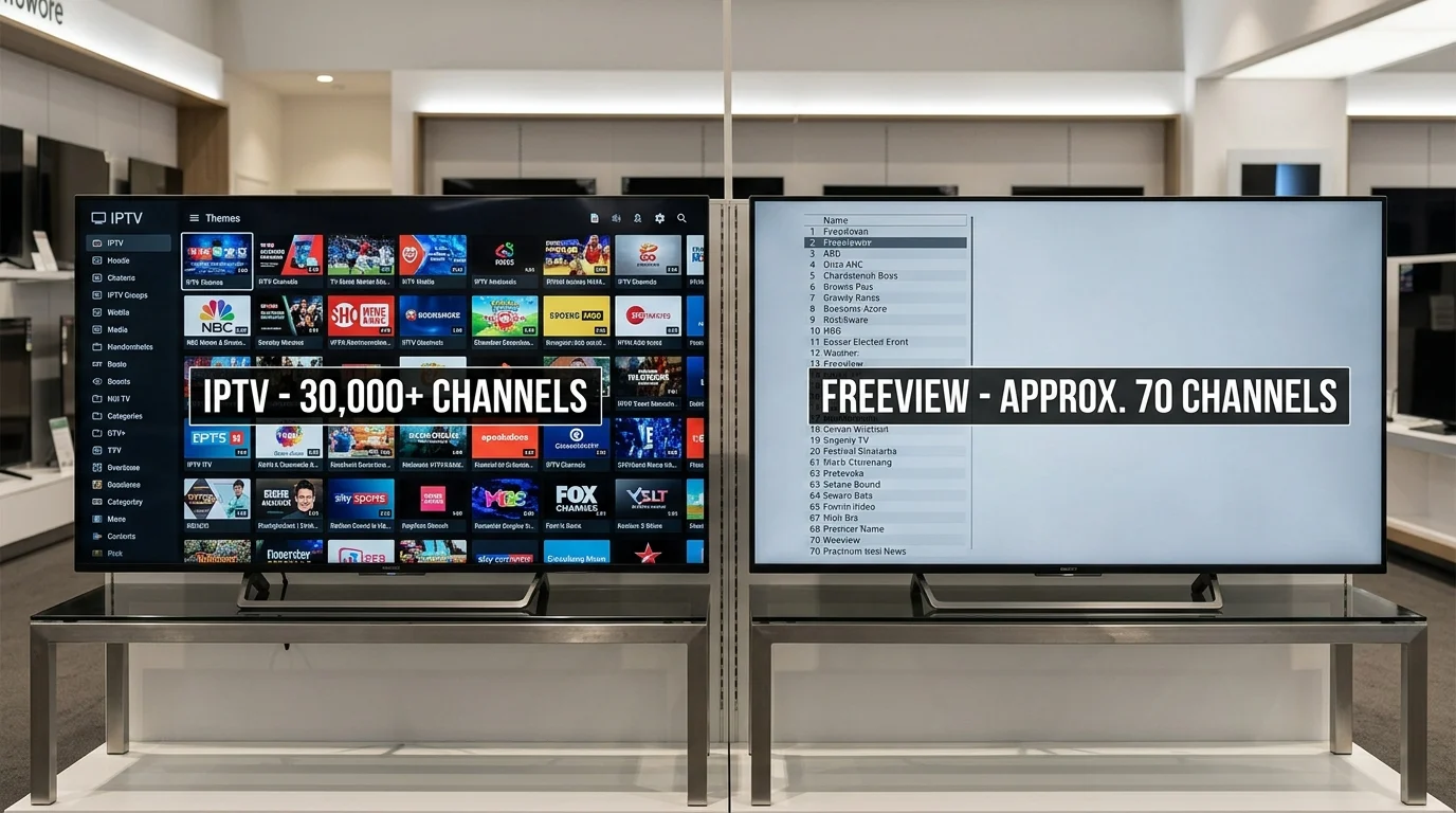 Freeview: ~70 channels. IPTV UK Elite: 30,000+ channels. IPTV includes all Freeview channels plus everything else.